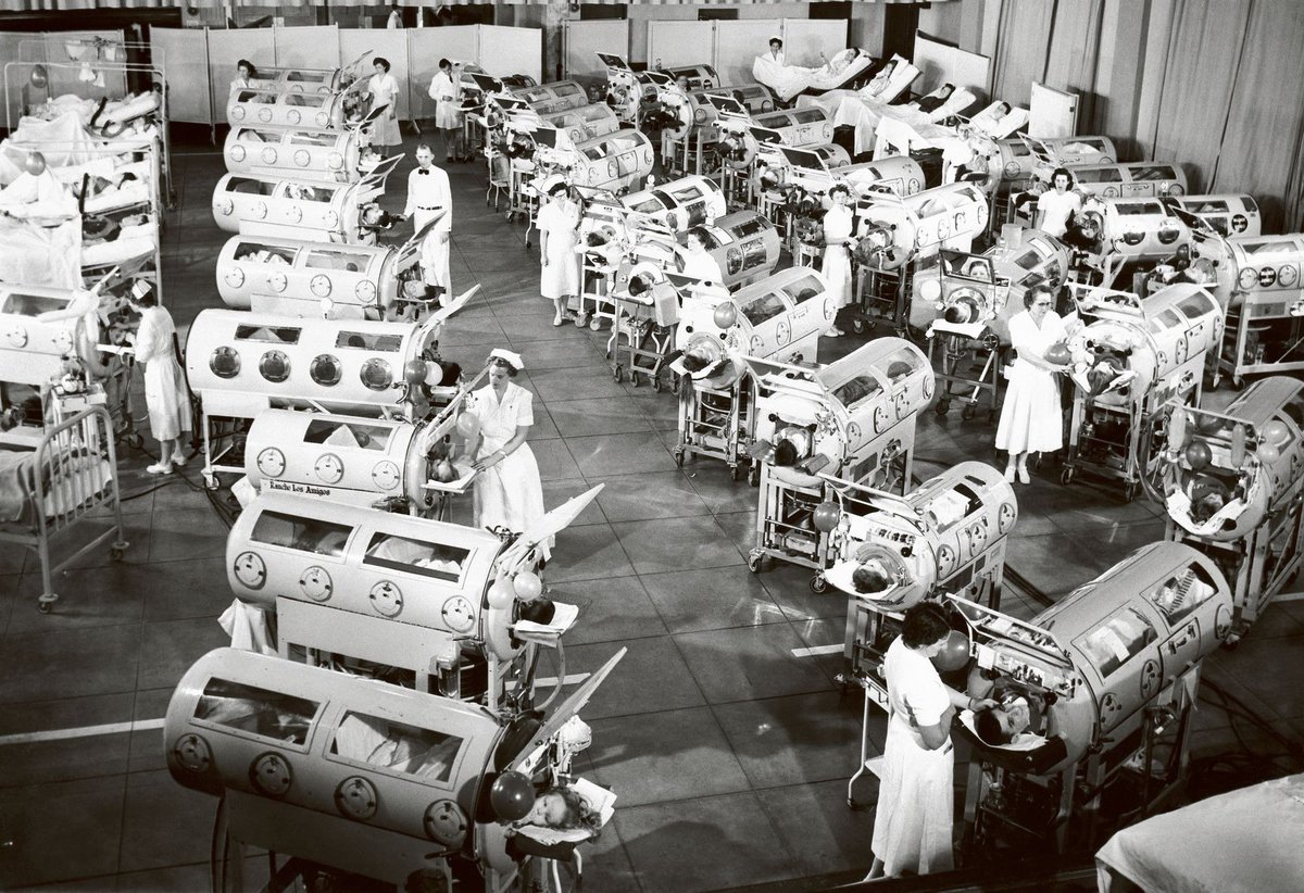 53. Encore une chose, cette image ci dessous est ce à quoi tout le monde pense quand ils pensent à la poliomyélite. Il s'agissait d'un coup publicitaire arrangé pour Life Magazine. La plupart de ces poumons de fer étaient neufs et se dirigeaient à travers le pays vers d'autres hôpitaux.